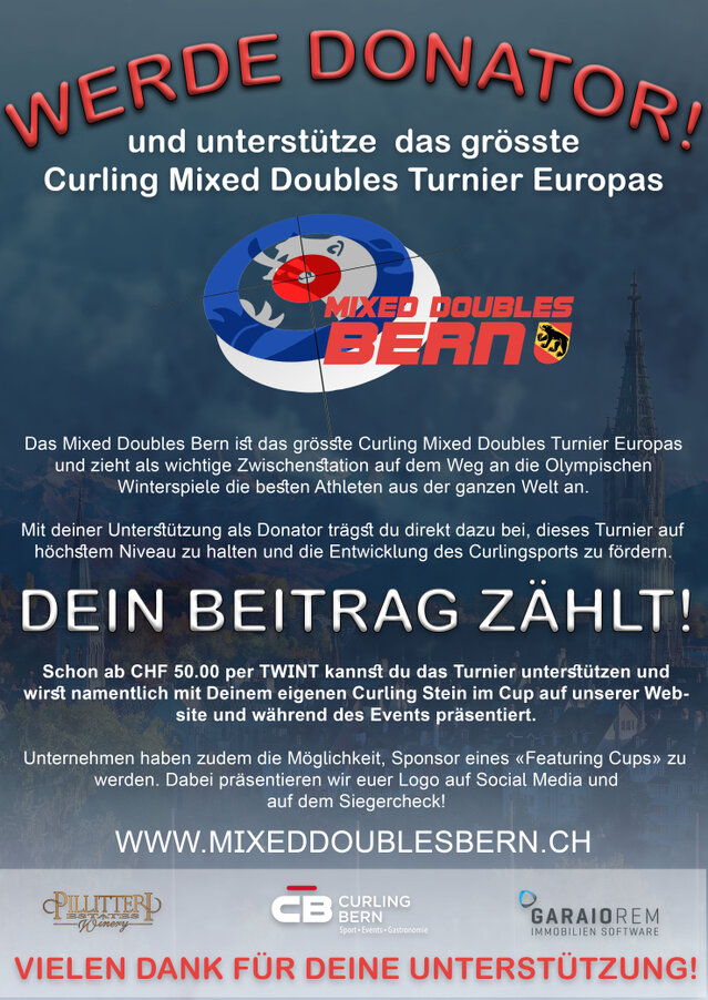 Curling Bern Allmend AG, die Betreiberin der Curlinghalle in Bern ist seit der ersten Ausgabe von unsererm Turnier ein wichtiger Unterstützer, auch aus finanzieller Sicht. Nur mit dieser Partnerschaft ist es uns möglich, das Turnier auf diese Art und Weise durchzuführen. Die Möglichkeit der Verwendung sämtlicher Räumlichkeiten erlaubt es uns, das Turner auch ausserhalb des sportlichen Teils für die Athleten, Partner und Zuschauer zu einem attraktiven Event zu machen.